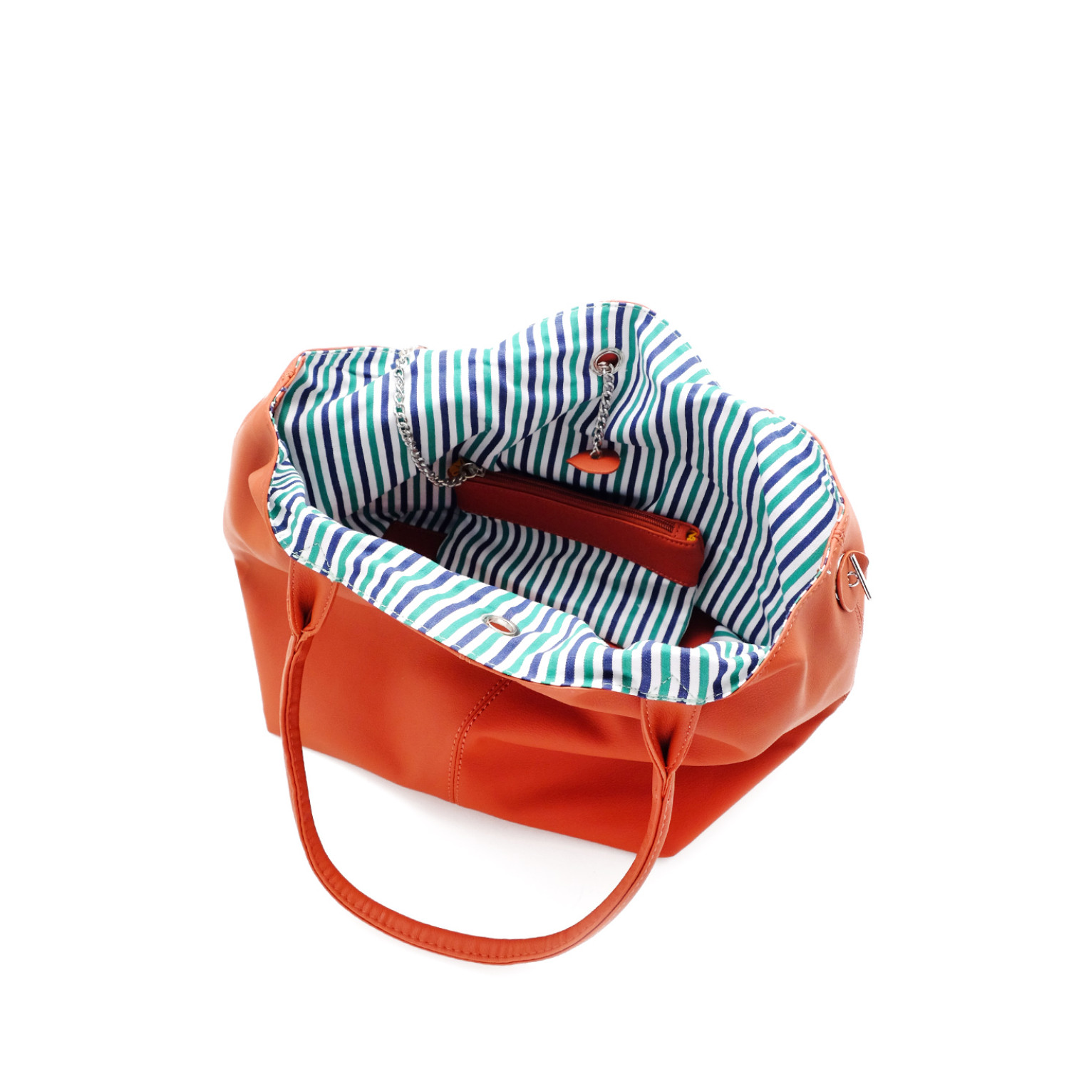 Двусторонняя сумка, можно носить на обе стороны. Застегивается на магнитную кнопку. Дополнительно идет маленькая сумочка-косметичка. Высота основных ручек 20 см. Размеры: ширина 27 см, высота 27 см, дно 19 см