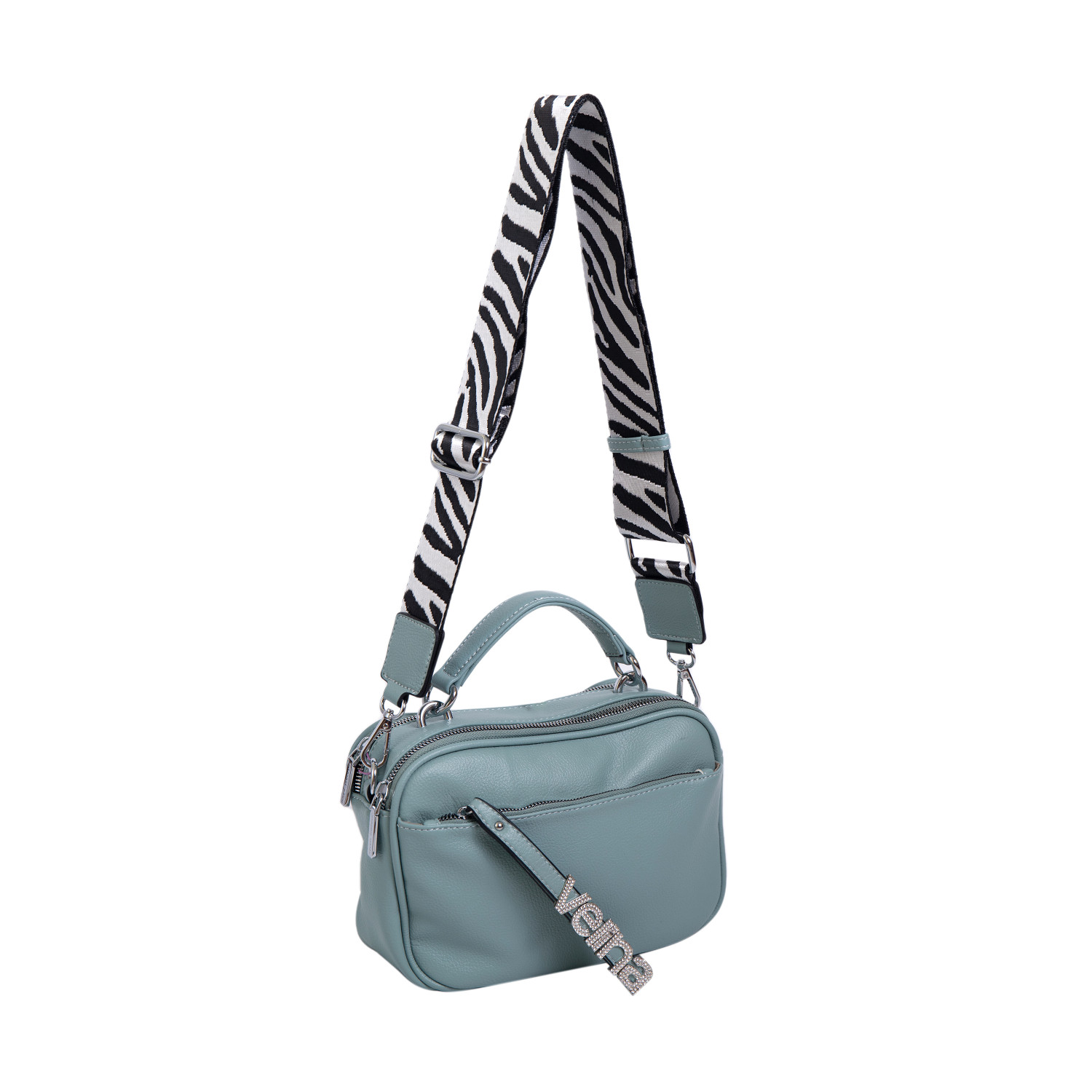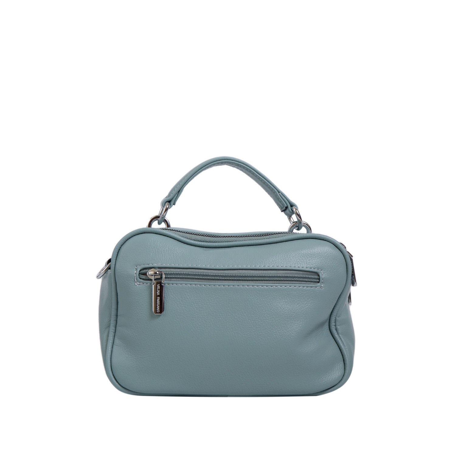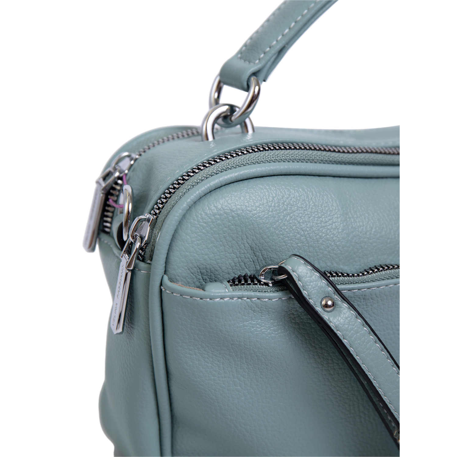 Сумочка на 2 основных отделения. Сзади карман на молнии, внутри 4 кармана для мелочей 2 из них открытого типа. На лицевой стороне карман на молнии декорирован стразами. Имеется 2 ремня-один из них регулируется - 105 см