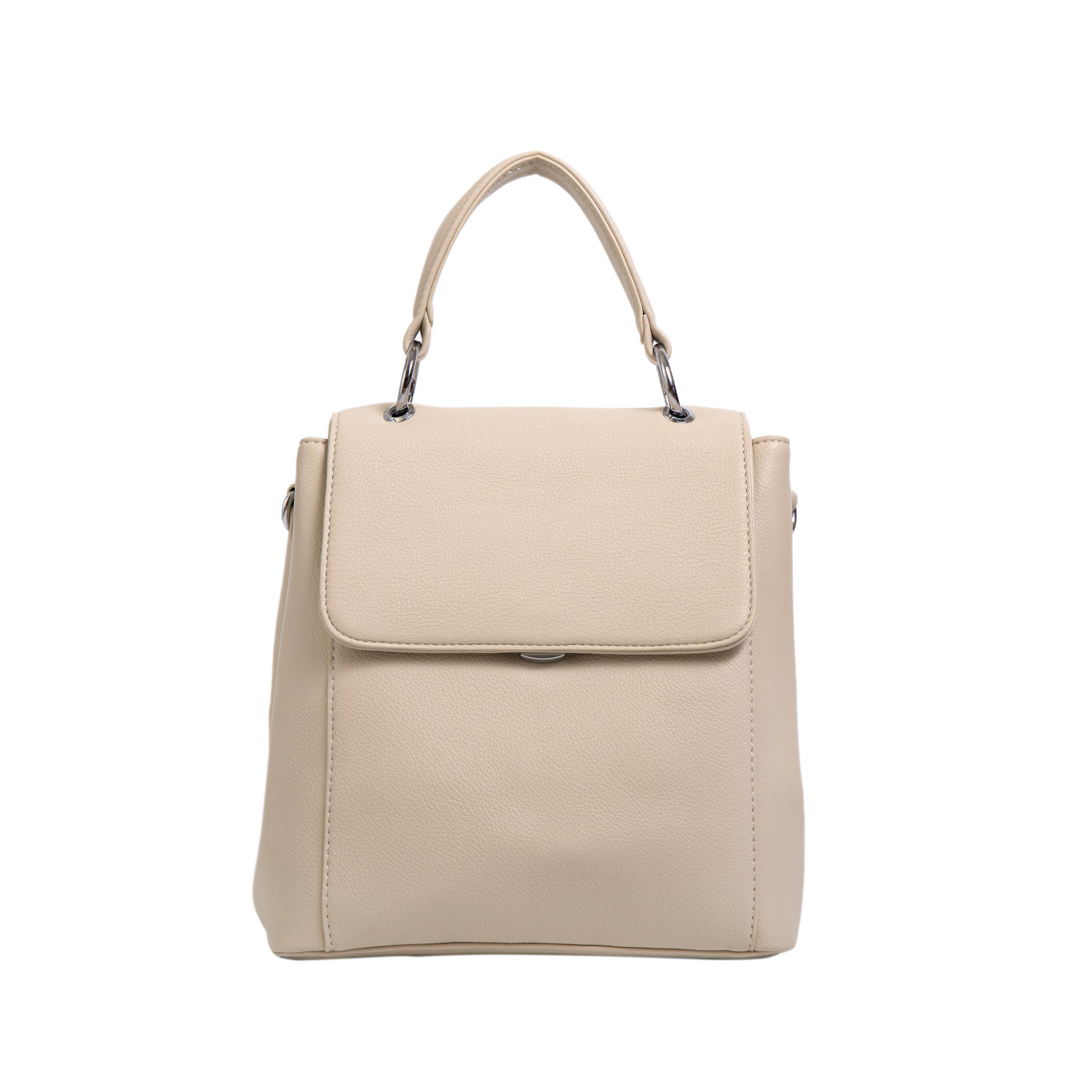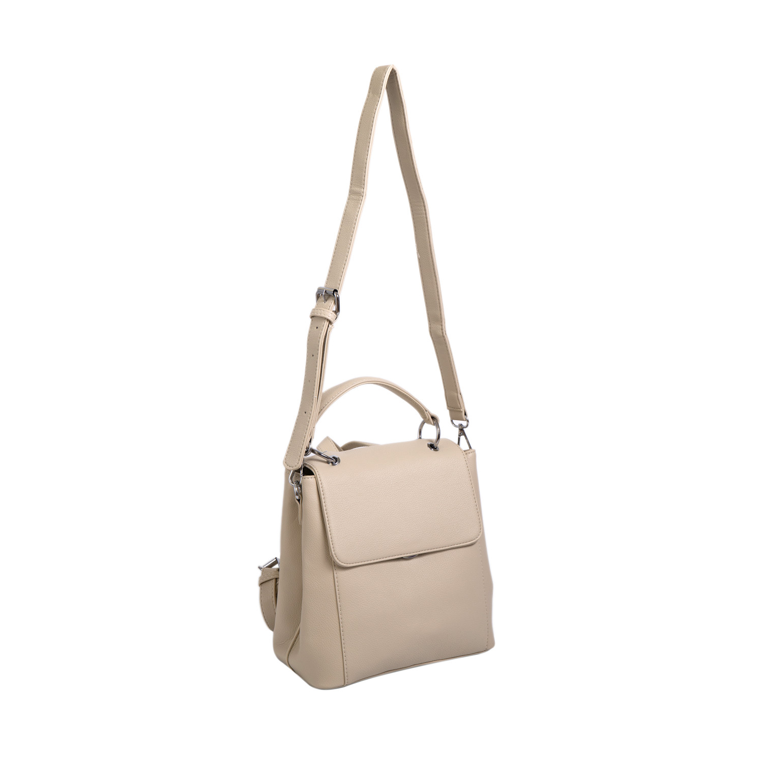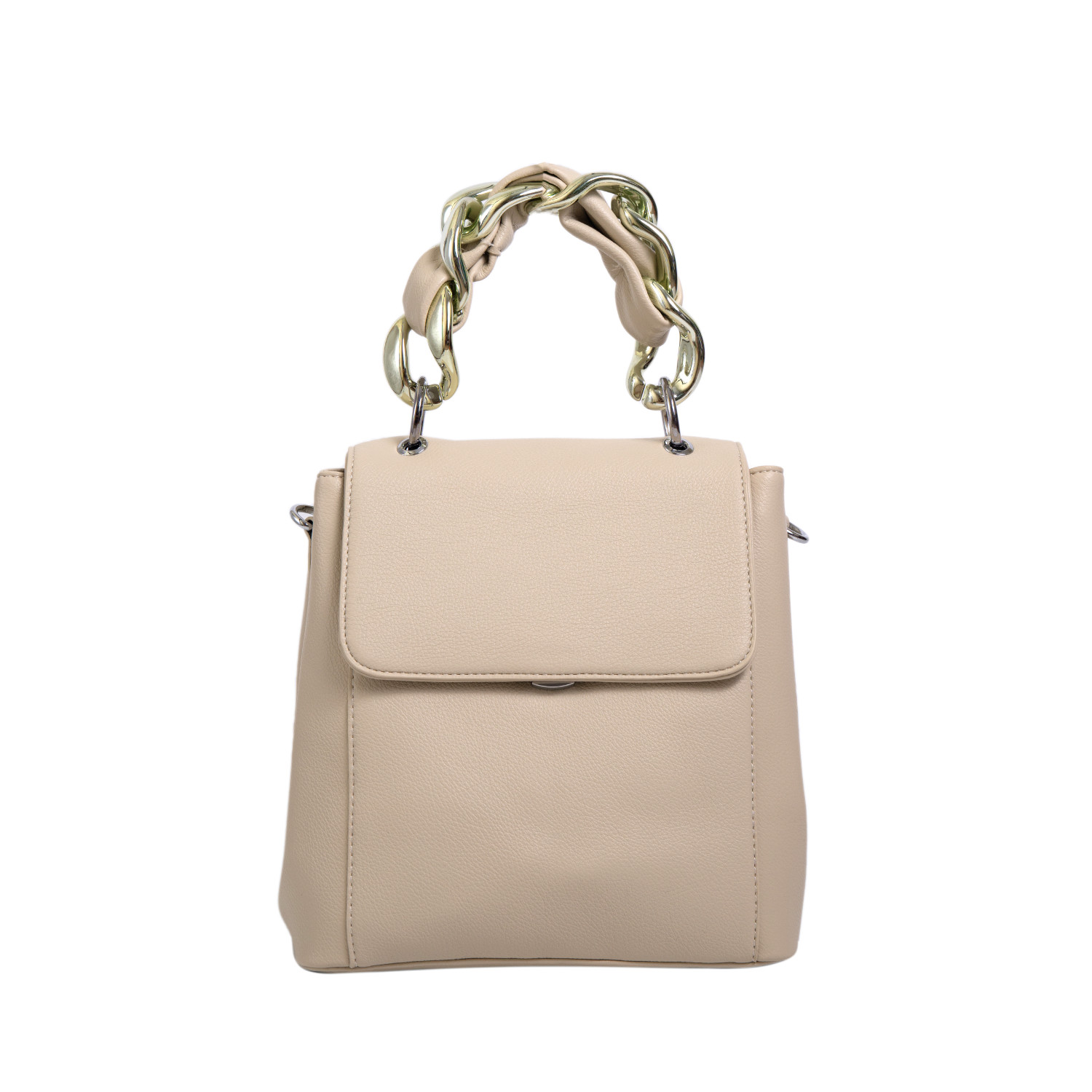 Рюкзак на одно основное отделения, закрывающийся на клапан. Сзади карман на молнии. Внутри два кармана, один из них на молнии. Имеется съемный регулируемый ремень длиной 120 см и ремень в виде цепочки. Размеры: ширина 23 см, высота 25 см, дно 13 см