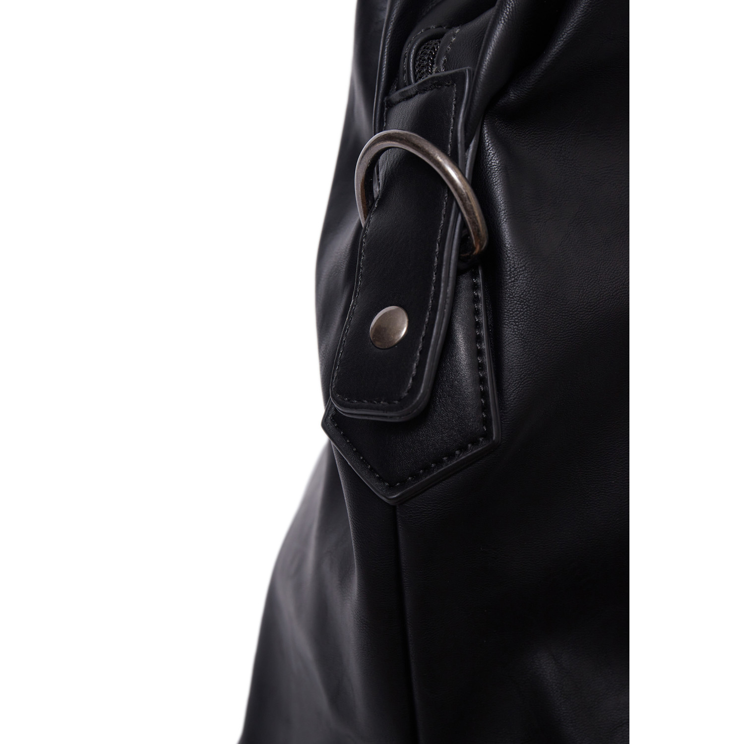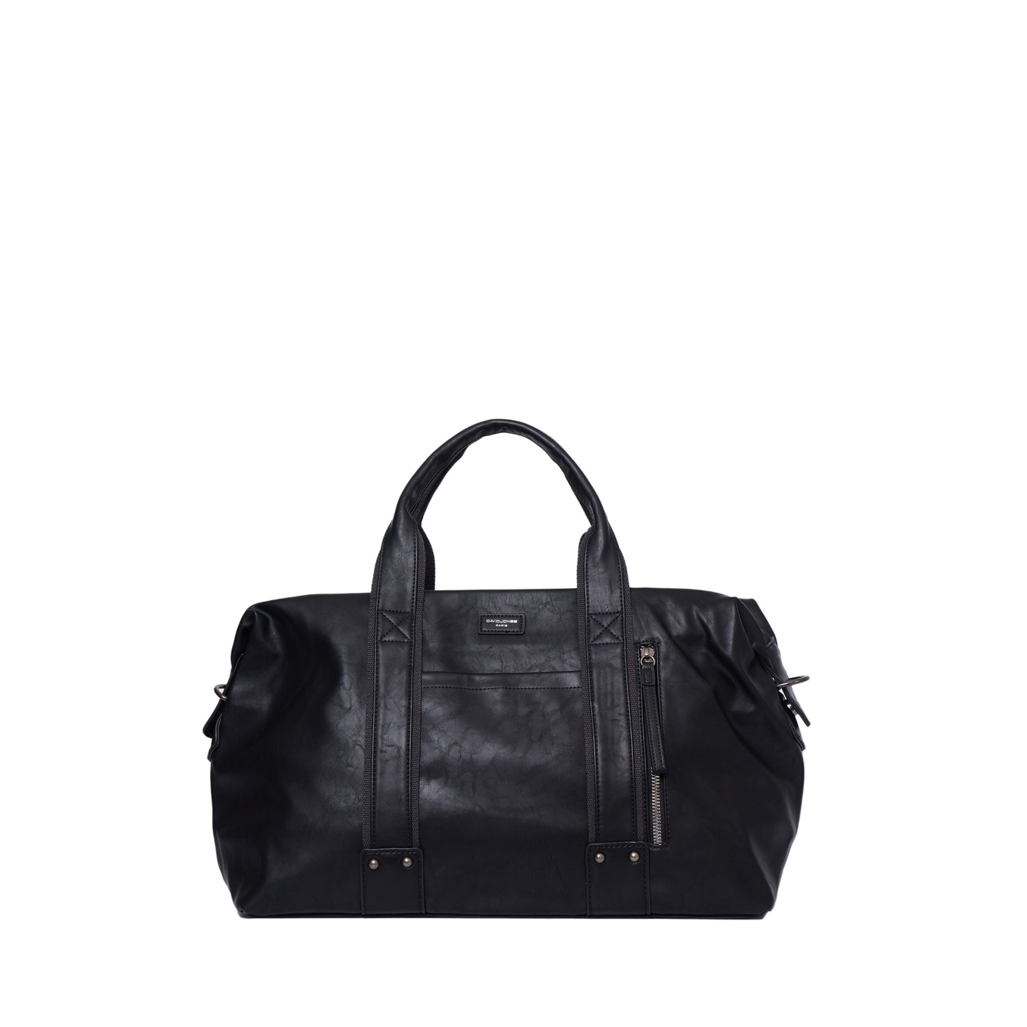 Вместительная дорожная сумка. Внутри одно отделение, два открытых кармана и один карман на молнии. Снаружи: на дне металлические ножки. Дополнительно: длинный ремень на карабинах. Высота основных ручек: 25 см. Размеры: ширина 48 см, высота 38 см, дно 19 см.
